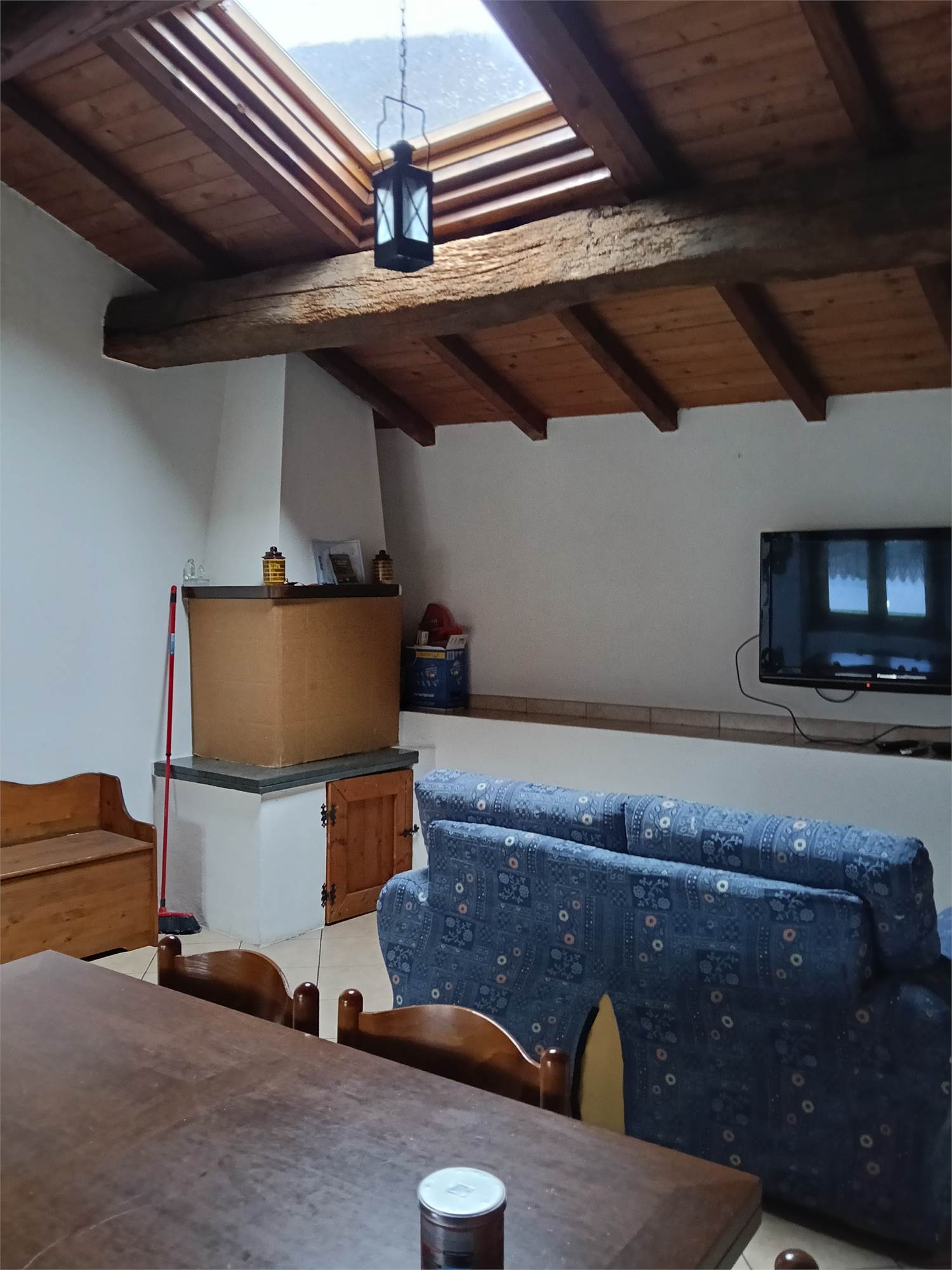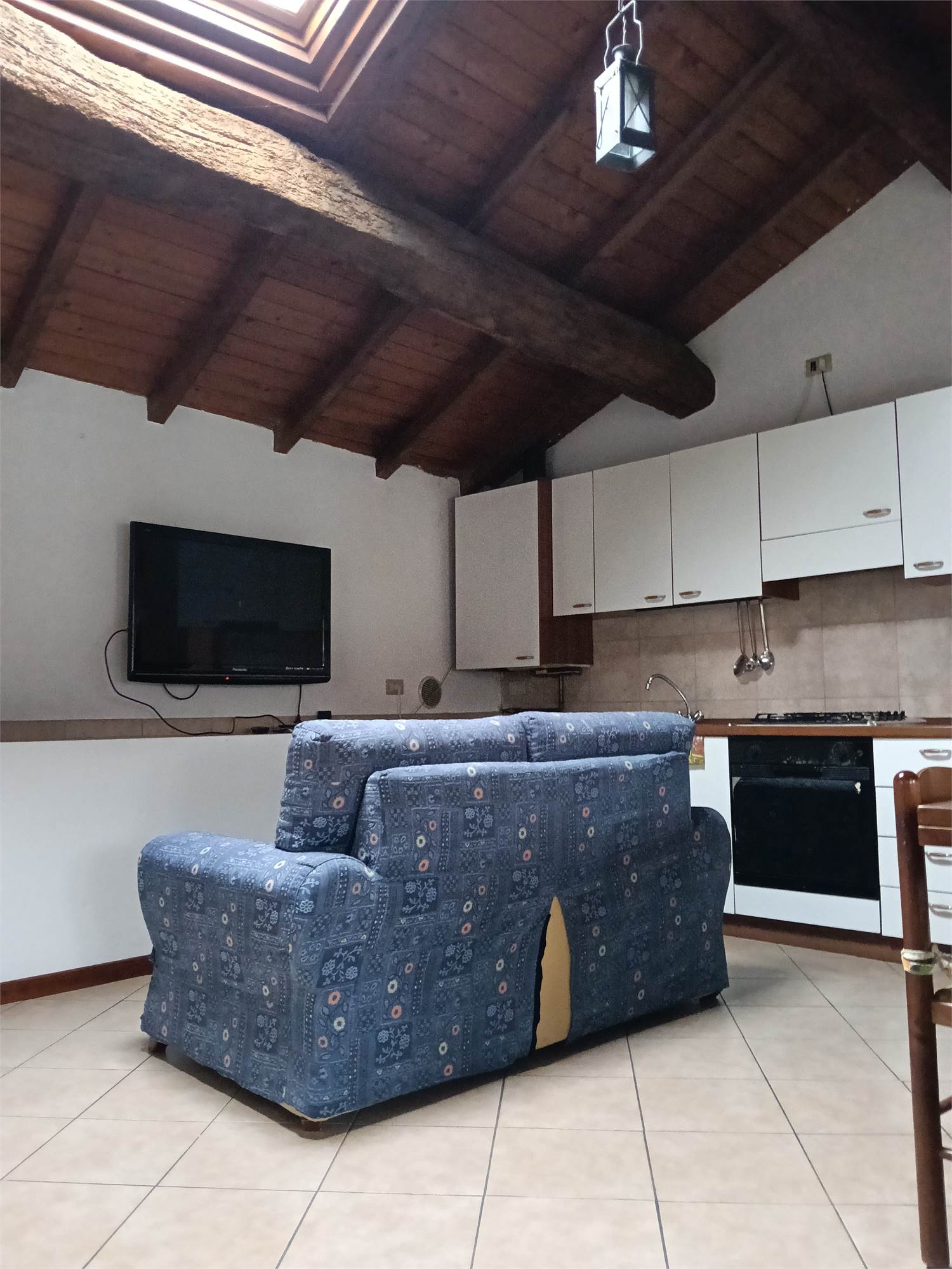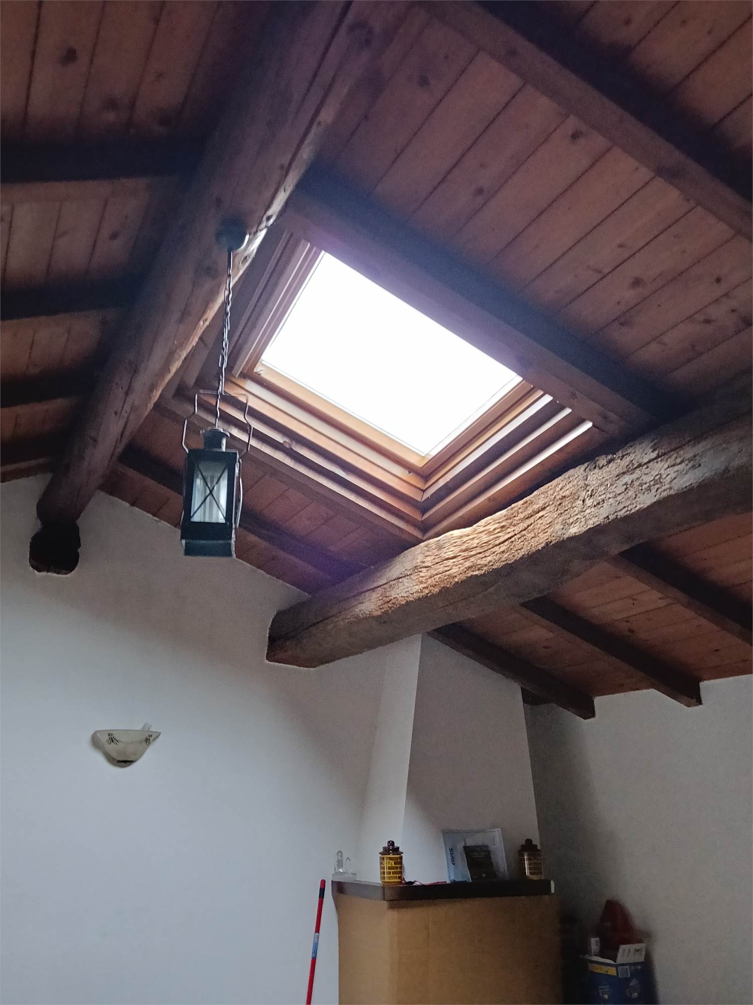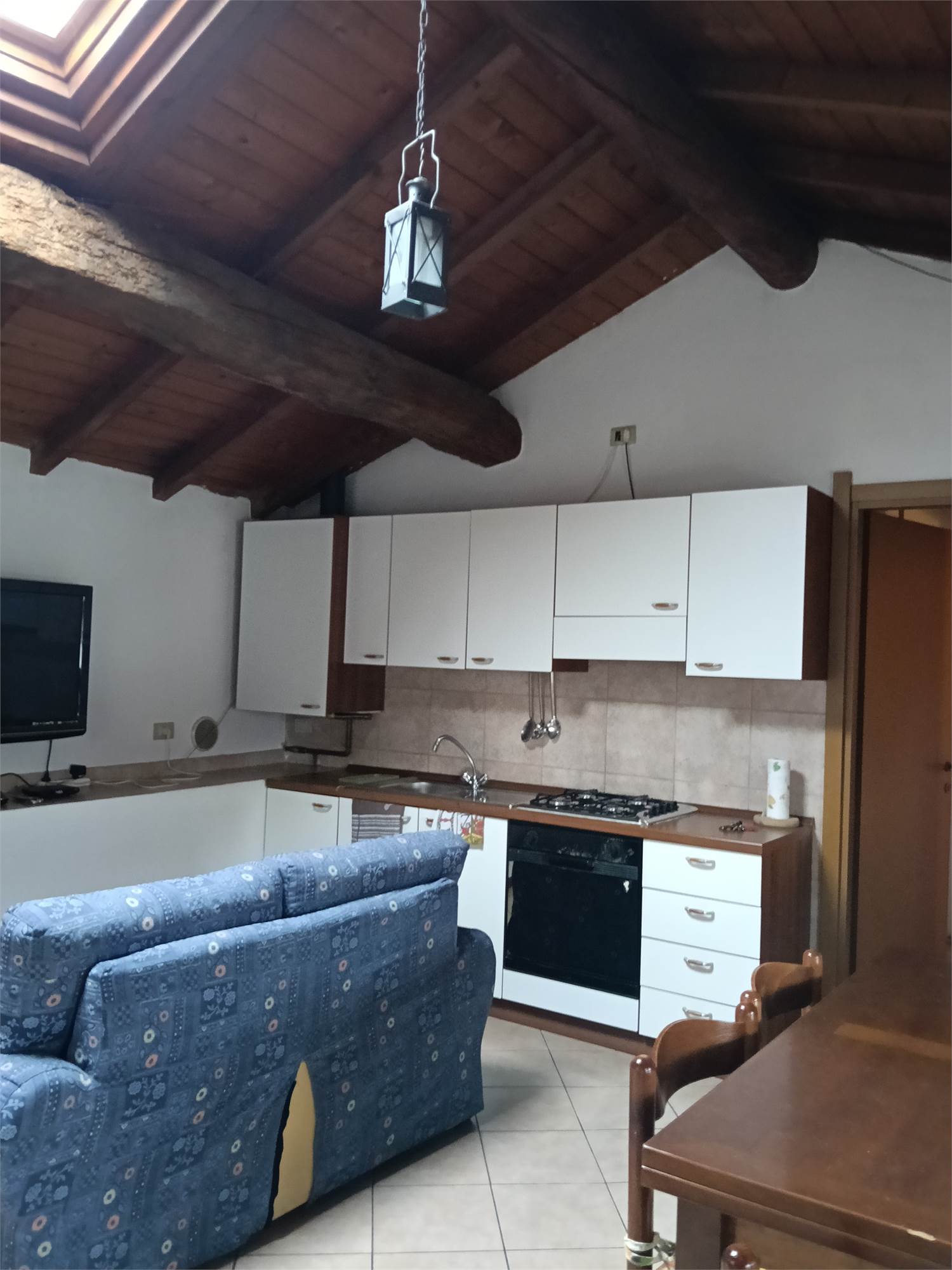 L'appartamento è al piano secondo , si sviluppa su unico livello , è composta da grande zona giorno con camino e cucina su misura e travi a vista , due ampie camere da letto matrimoniali con travi a vista , disimpegno e bagno spazioso con doccia e travi a vista .